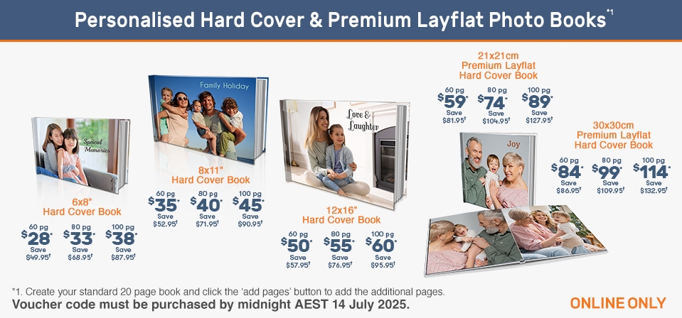 Harvey Norman PhotoCentre Terms and Conditions: Buy Now Create Later deal ends midnight AEST 14 July 2025, and the voucher code must be purchased by midnight AEST 14 July 2025. The voucher code is valid for 3 months from midnight AEST 14 July 2025 and the order must be finalised by midnight AEDST 14 October 2025 when the voucher code will expire. Only one voucher code can be used for each product. If you wish to order multiple Photo books you must purchase a separate voucher code for each project and delivery charges apply for home delivery for each order. If the voucher code has not been redeemed by midnight AEDST 14 October 2025, the code will convert into a gift card and be used towards the purchase of any product (excluding for the purchase of Buy Now Create Later codes) on the Harvey Norman PhotoCentre site for 3 years ending on midnight AEDST 14 October 2028. At the end of the 3 year period, the gift card will expire. No delivery charges apply when in store pick up is selected. *1. Create your standard 20 page book and click manage pages to add the additional pages. †Savings are based on the standard Harvey Norman PhotoCentre prices and do not apply to delivery charges which are additional when home delivery is selected. Delivery charges can be found here: https://www.harveynormanphotos.com.au/pages/delivery-information. No delivery charges apply if picking up from store. Terms & Conditions of Harvey Norman PhotoCentre apply, view them at www.harveynormanphotos.com.au