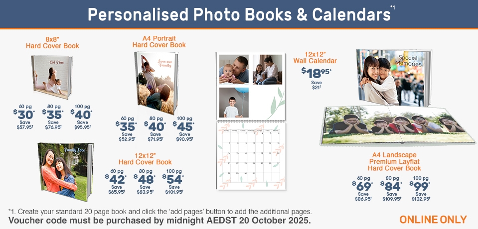 Harvey Norman PhotoCentre Terms and Conditions: Buy Now Create Later deal ends midnight AEDST 20 October 2025, and the voucher code must be purchased by midnight AEDST 20 October 2025. The voucher code is valid for 3 months from midnight AEDST 20 October 2025 and the order must be finalised by midnight AEDST 20 January 2026 when the voucher code will expire. Only one voucher code can be used for each product. If you wish to order multiple Photo books you must purchase a separate voucher code for each project and delivery charges apply for home delivery for each order. If the voucher code has not been redeemed by midnight AEDST 20 January 2026 , the code will convert into a gift card and be used towards the purchase of any product (excluding for the purchase of Buy Now Create Later codes) on the Harvey Norman PhotoCentre site for 3 years ending on midnight AEDST 20 January 2029. At the end of the 3 year period, the gift card will expire. No delivery charges apply when in store pick up is selected.